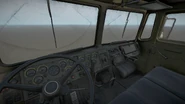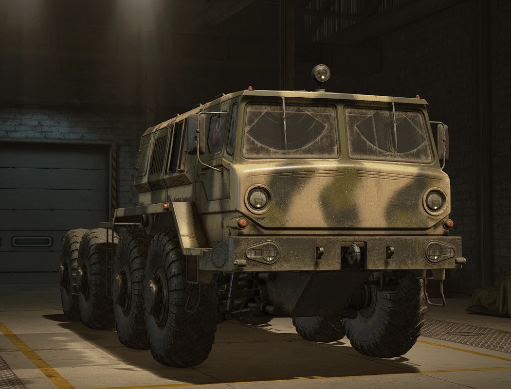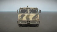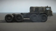 The 605R is primarily based on a MAZ-537 and closely resembles a modernized take on the vehicle, the vehicle design also appears to use inspiration from the ZIL-135. It features a more streamlined appearance with some very prominent changes. each corner of the cab and sides are angled giving the vehicle its streamlined appearance akin to the curved corners seen in the ZIL-135. Its headlights and turn signals are noticeably smaller as well and the turn signal placement draws further similarities to a ZIL-135. The front bumper is a bit smaller as well and has built in fog lights but the bumper retains its tow hook. The bumper also curves around the front of the vehicle and wraps around the entire front section of the vehicle giving it a smoother appearance. The driver and passenger windows have more rounded edges as opposed to sharp corners and the lower corners positioned closer to the rear of the cab are angular. Overall besides its more modern looking design and smoother curves in the body, the 605-R is very similar to its real world inspiration with some design features being identical to its real world counterpart. One obvious example of this is the vehicles use of independent suspension with torsion bars on its front 2 axles with independent walking beam suspension on its rear axles.